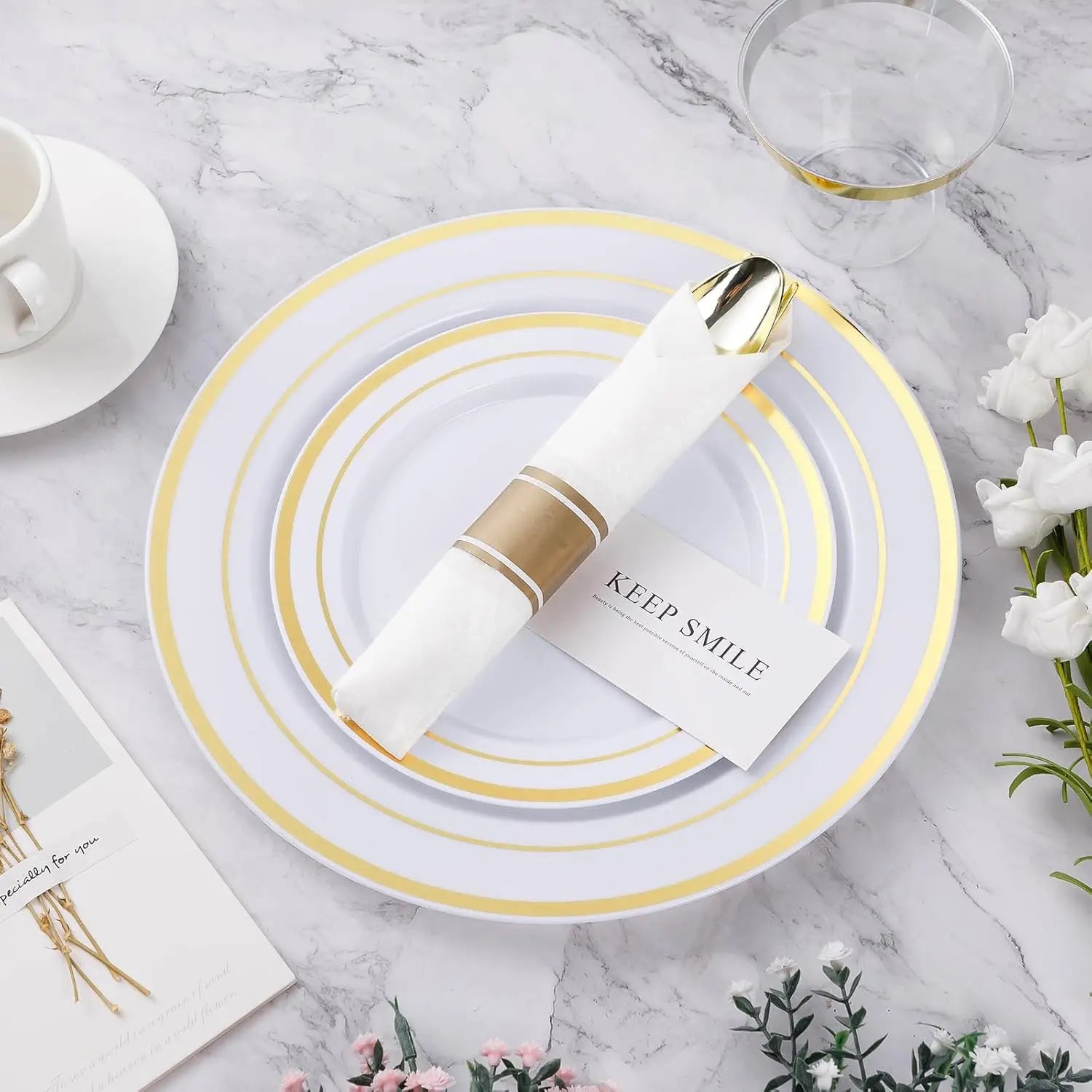 Include: 100 Plastic Plates, 50 Pre Rolled Napkins with Gold Silverware, 50 Cups